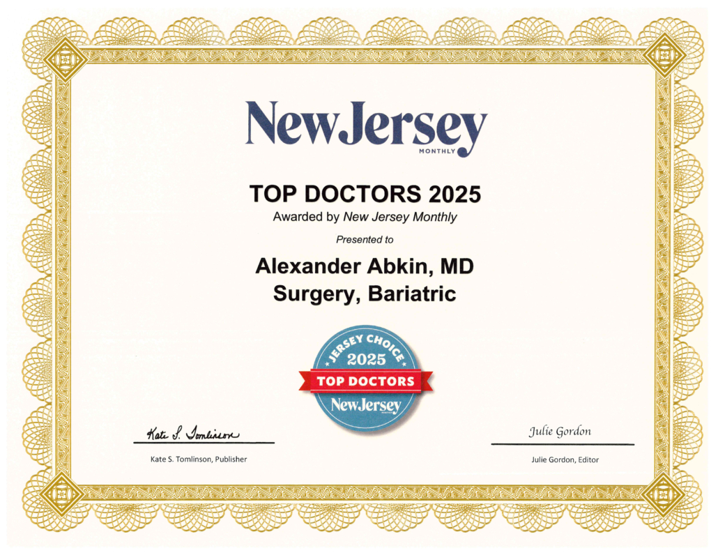 Dr. Alexander Abkin, renowned New Jersey bariatric surgeon, has once again been recognized as a New Jersey Top Doctor in Bariatric Surgery for 2025 by New Jersey Monthly Magazine. This prestigious honor marks the 18th consecutive year that Dr. Abkin has earned this distinction, underscoring his exceptional expertise and unwavering commitment to improving the health and well-being of his patients through life-changing weight loss surgery.
